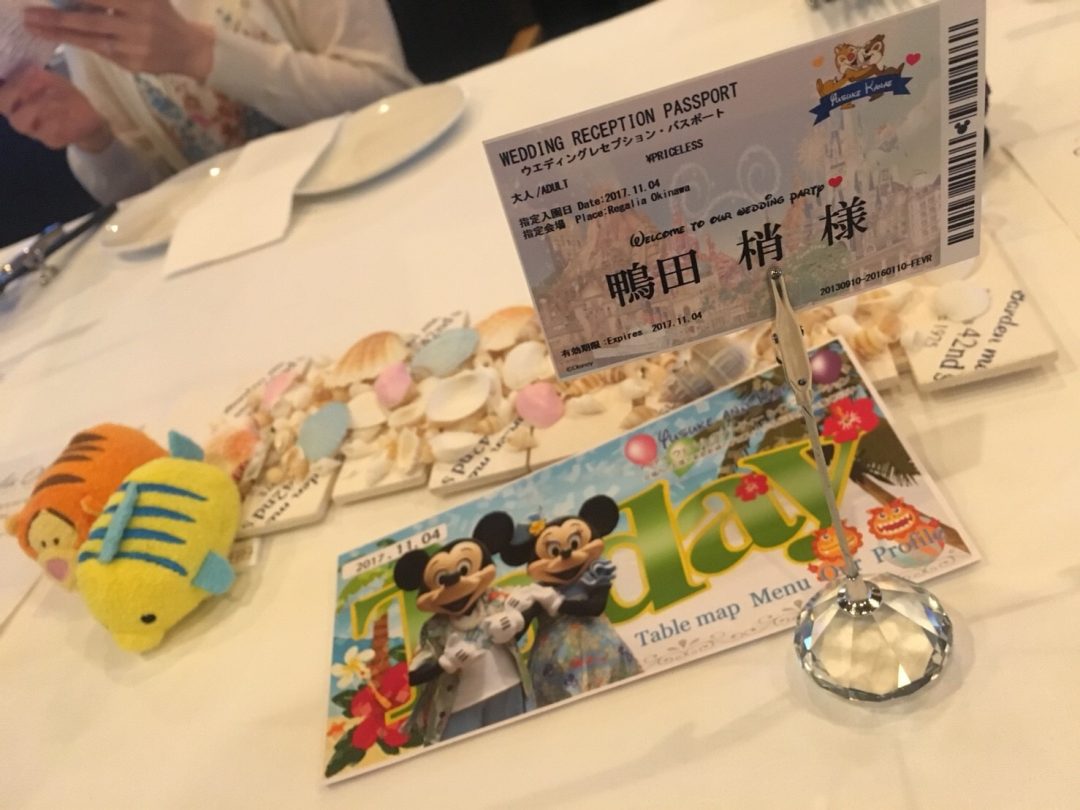 この日の為に、招待状をディズニーパスポート風に制作なさって、席札も「ワンデイ・パス風」に。